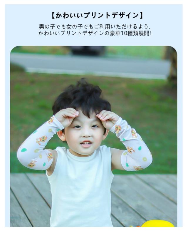 | 紫外線遮断率?98% UPF50+ 接触冷感 吸汗速乾 手の甲までしっかりカバー! プリントデザインがかわいい♪ キッズ用アームカバー 子供向けの安全で無毒なグレードAの生地で安心! 【ひんやり冷却!】接触冷感の材質を採用して、汗をかいたり水に触れたりした時、氷水と洋の満れが熱の作用を気化させ、気化吸熱原理に基づいて。冷却効果があります。 【UPF50+紫外線遮断率?98%で肌を守る!】日差しの強い時期の紫外線から肌を守ることが期待できる日焼け対策として!野外での活動にもおススメ! 【伸縮性・通気性・速乾性抜群】フリーサイズですが、伸縮性が抜群で、肌にぴったり、肘関節の曲げ伸ばしが楽になります。さらに通気性も抜群で速乾性も抜群なので夏場も快適にお過ごしいただけます。 【指掛けタイプ】指穴が付いているため、手元が自由に使え、活動時にも使いやすいです。 【ズレ落ち防止】引き締めるデザイン、手や肘の曲げ伸ばしによるずリ上がりやずり落ちりの心配がなし!活発なお子様でも安心! 【色んな場面で使いやすい!】薄いのに引っ掛けても破れにくいアイスシルク素材、汗や湿気を素早く吸収・乾燥のドライ設計でスポーツ時はもちろん、プールや海水浴などのアウトドアにもぴったり! 【かわいいプリントデザイン】男の子でも女の子でもご利用いただけるよう、かわいいプリントデザインの豪華10種類展開!アウトドアやスポーツ観戦、外遊びやお散歩など、日焼けが気になるシーンの様々なお悩みをキュートに解決♪ ご家族やお友だちとお揃いにもおすすめです! | |
