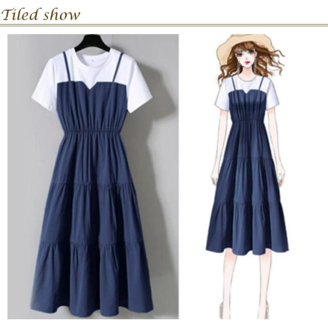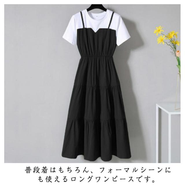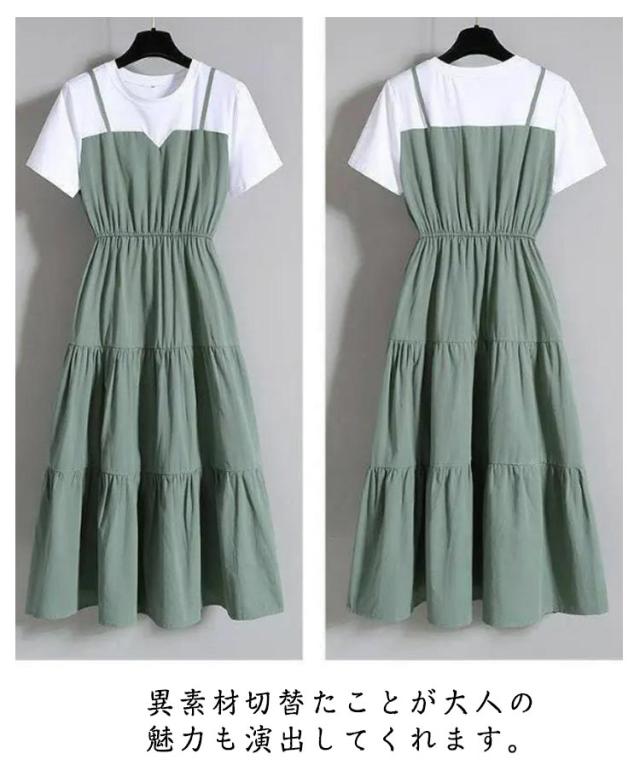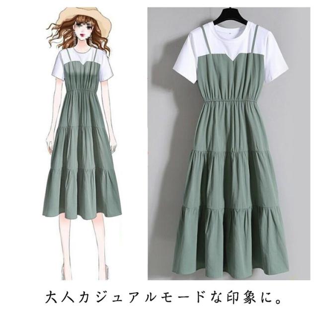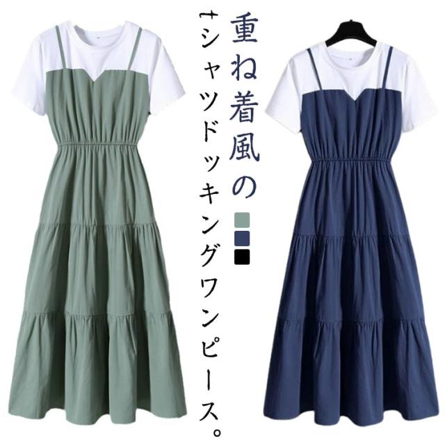大きサイズ 夏 重ね着風 半袖 tシャツワンピース ワンピース ティアード レイヤード ロングワンピース マキシ丈 ロング丈 切り替え デイリー お出かけ 大きいサイズ 春 レディース