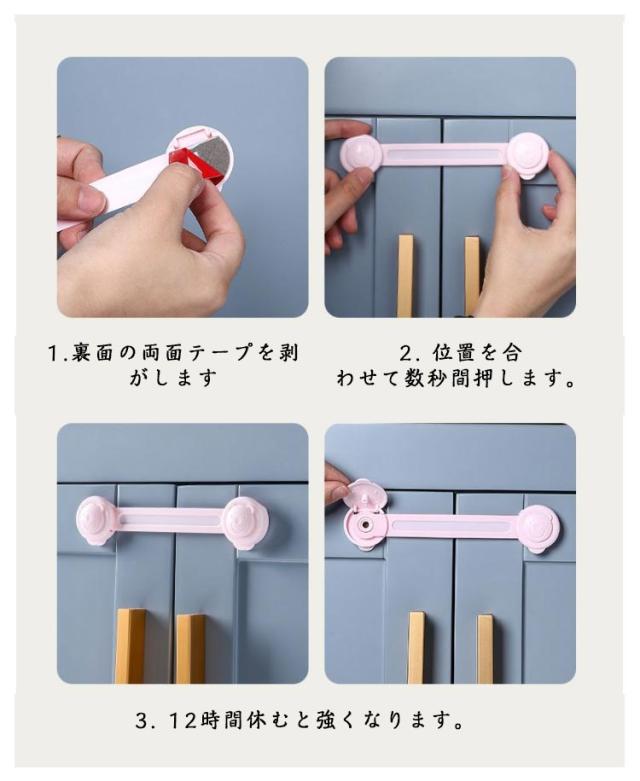 | チャイルドロック 4個セット 赤ちゃんがキャビネットを開けたり、誤って製品などを食べたりするのを効果的に防ぎます。 引き出しはロックできるのでお子様の挟み込みを防止します さまざまな家具キャビネットのドアや冷蔵庫に適しています。電子レンジなど 説明書: 1.裏面の両面テープを剥がします 2. 位置を合わせて数秒間押します。 3. 12時間休むと強くなります。 | |