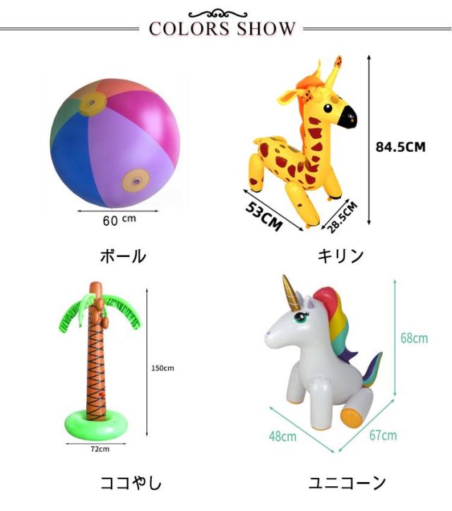 | 色 | ボール キリン ココやし ユニコーン タコ 鯨 イルカ 旋転棒 |