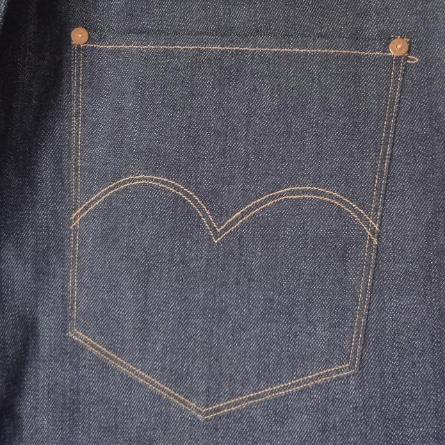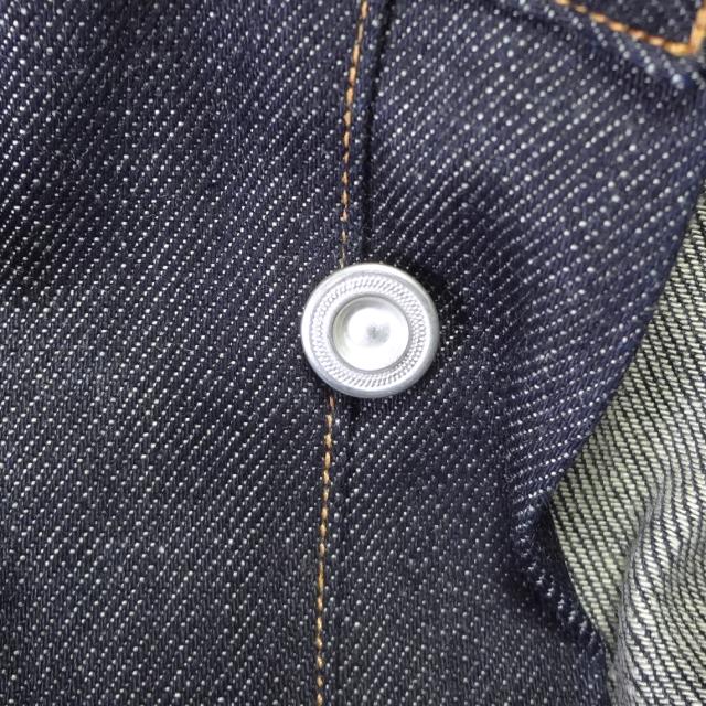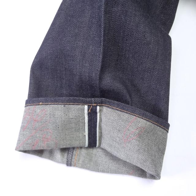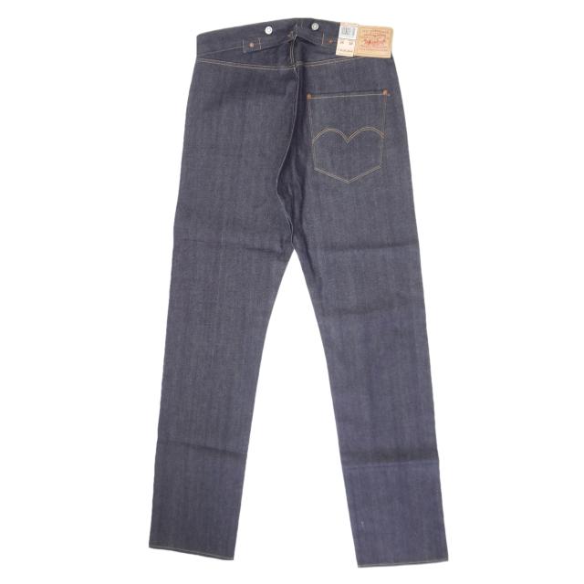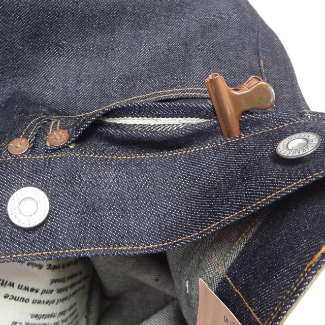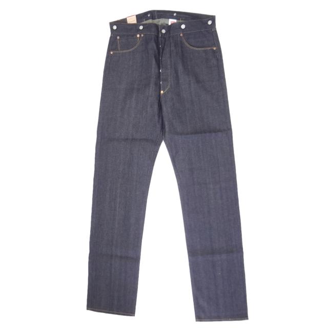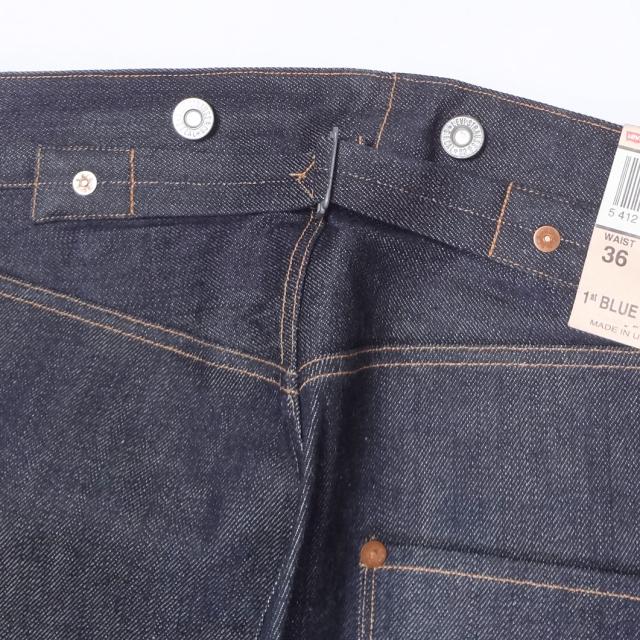 ・アーキュエットステッチ、レザーパッチ、クロッチリベット、バックストラップ、ボタンフライ、4ポケットリベット、コインポケット裏赤耳、赤耳デニム、サスペンダーボタン
