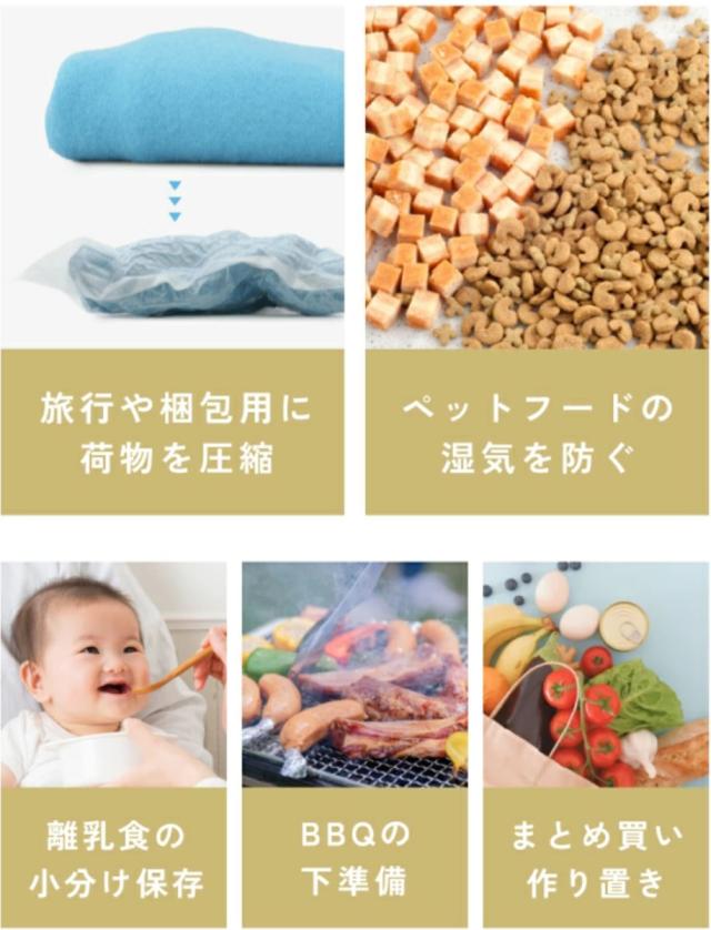 食材を袋ごと真空状態にすると圧縮され、冷蔵庫や冷凍庫内のスペースを効率良く使えます。また、衣類を圧縮してコンパクトにしたり、ペットフードの袋をシールして密閉など食材以外でも便利にお使いいただけます。