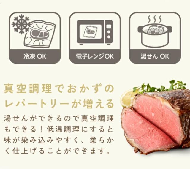冷凍、電子レンジ、湯煎に対応しているので、真空保存した直材をそのまま調理することができます。