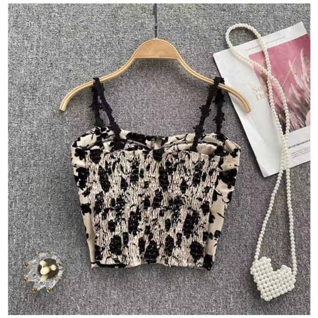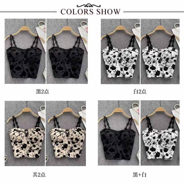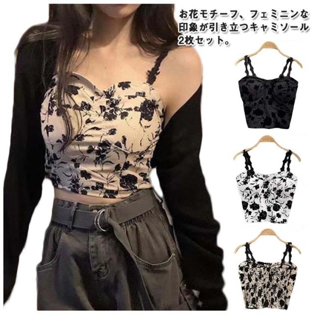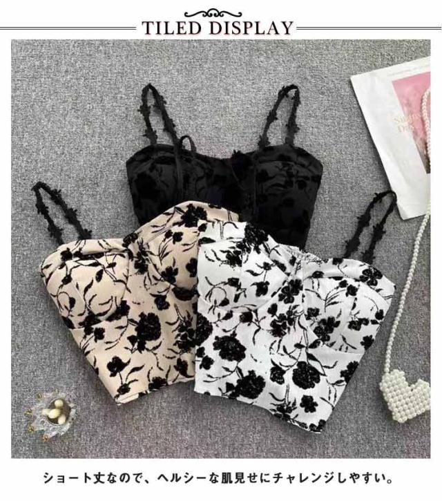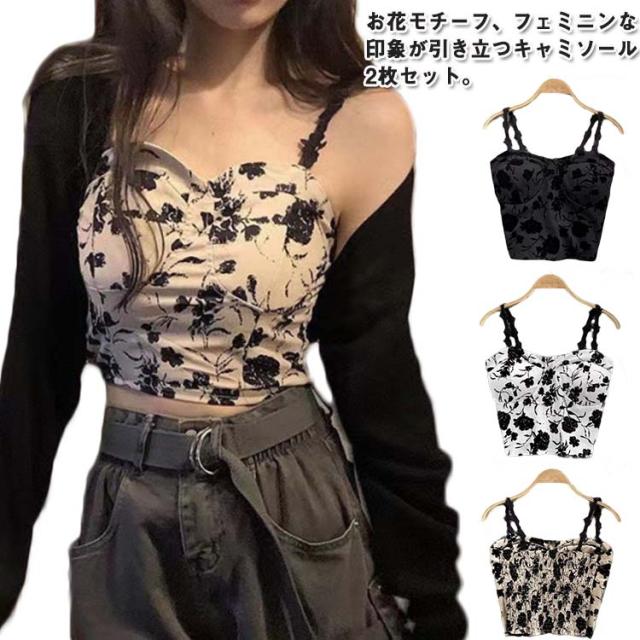 お花モチーフ キャミソール ショート 2点セット ショートキャミソール ショートキャミ ショート丈 アンダーウェア 見せキャミ フェミニン セクシー おしゃれ ブラック ホワイト ベージュ ビンテージ かわいい