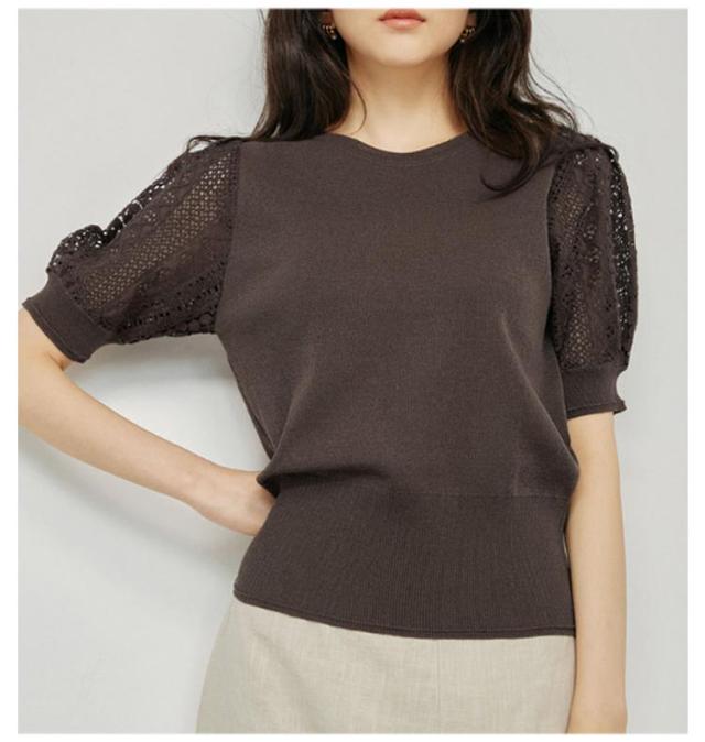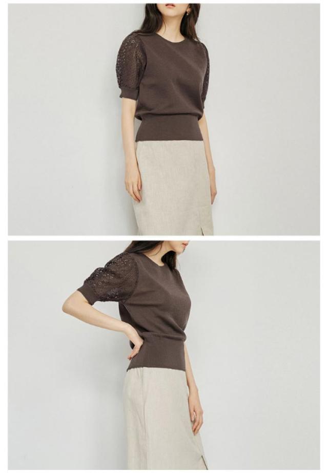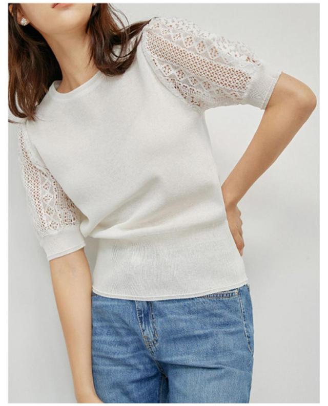 | 透かし編み袖デザイン!接触冷感素材を使用、涼しげで透け感のある柔らかいサマーニットプルオーバー。 カジュアルにも綺麗めにも、合わせるアイテムによって色々なシーンに活躍します。 | |