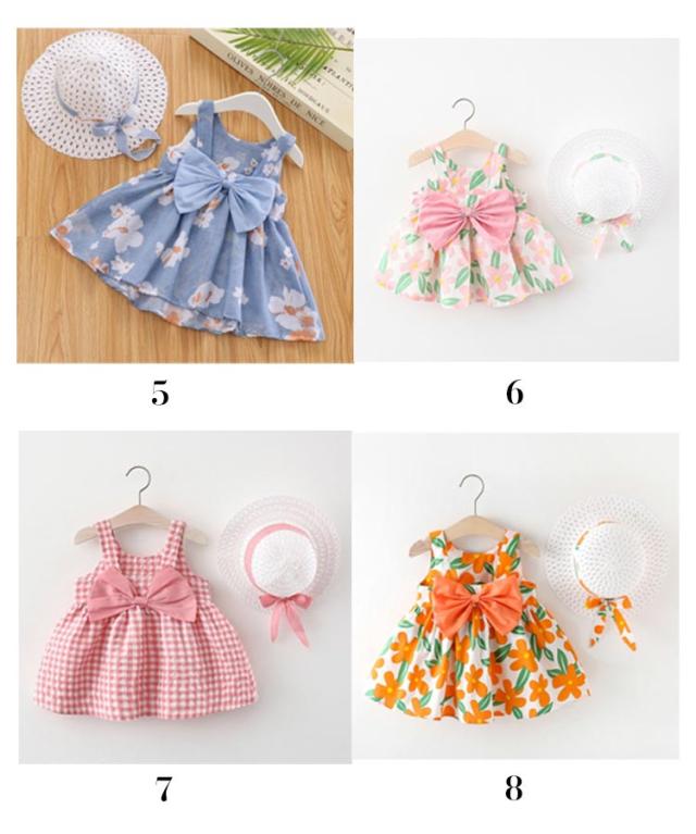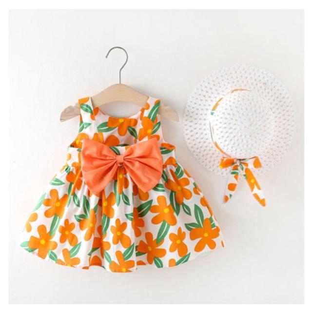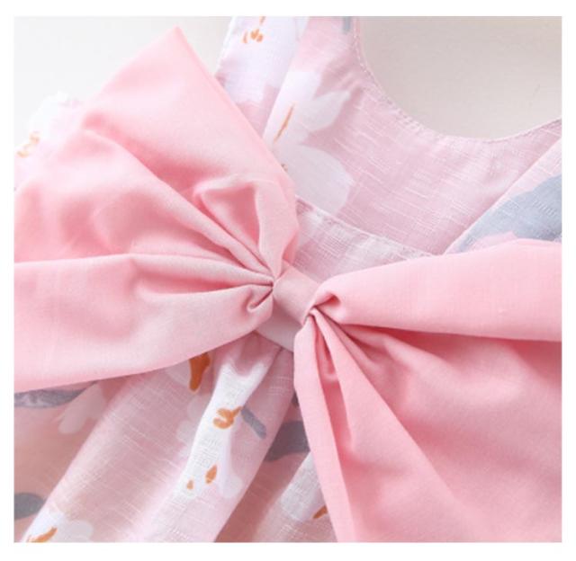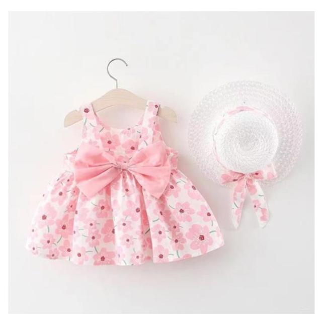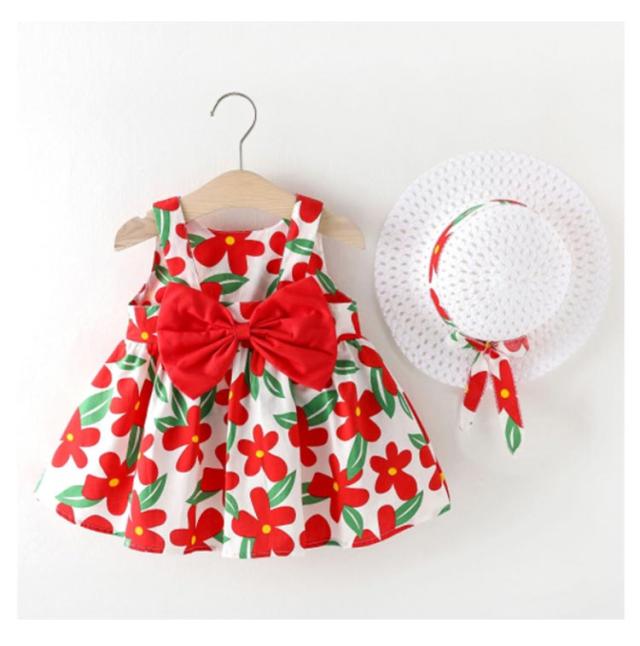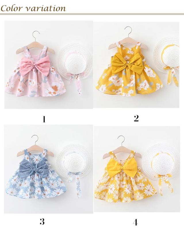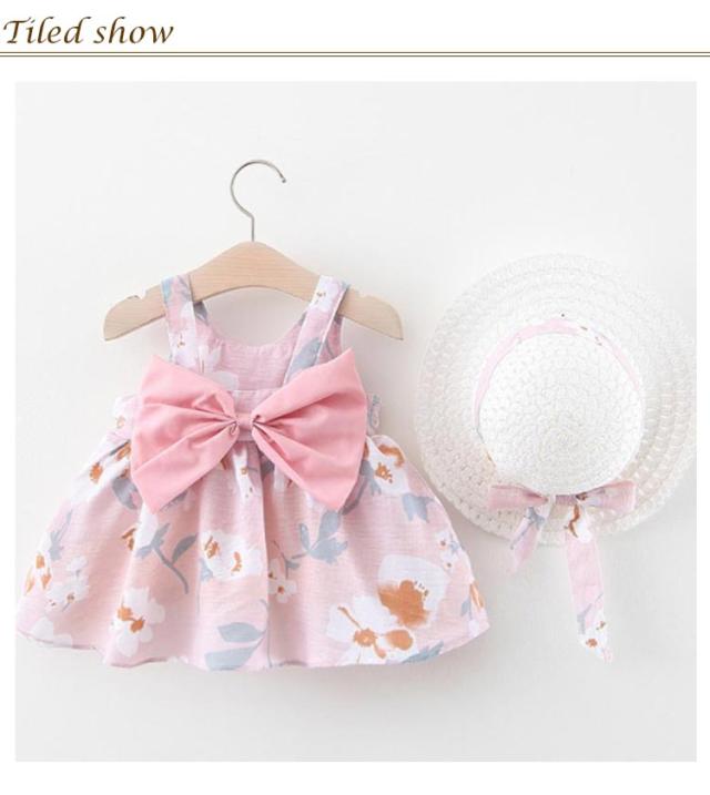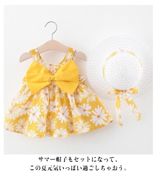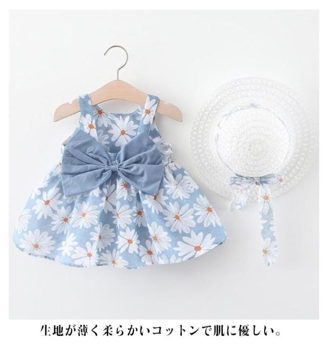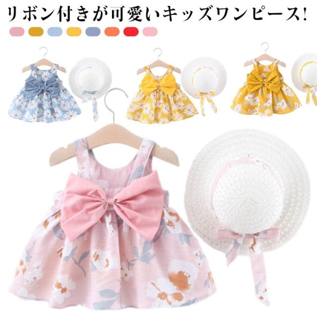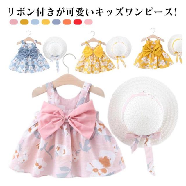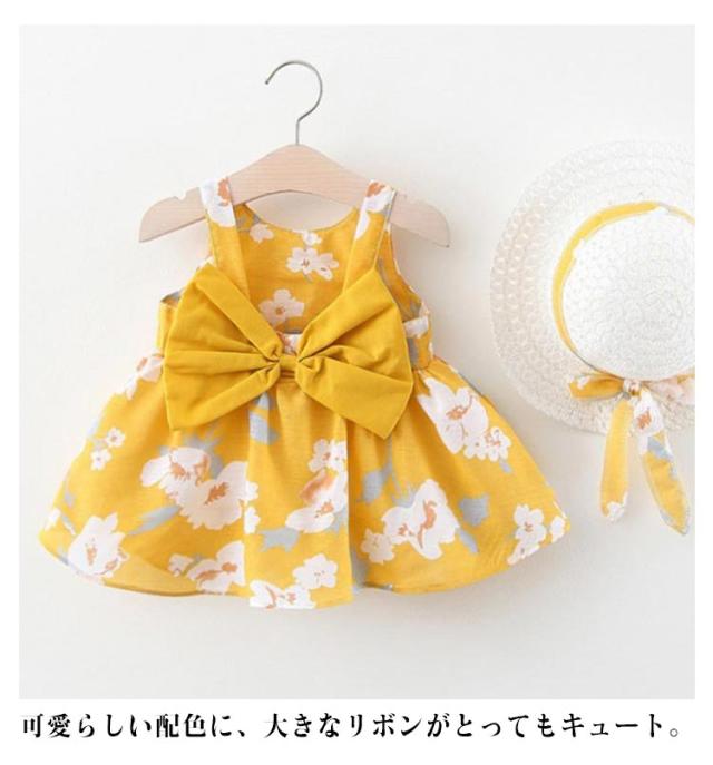 帽子付属!ベビー キッズ ワンピース 子供ワンピース ベビーワンピース サマー帽子付き 女の子 ベビードレス 子ども 赤ちゃん 出産祝い ノースリーブ 韓国風 花柄 大きめリボン 73 80 90 100cm 夏 お出かけ 送料無料