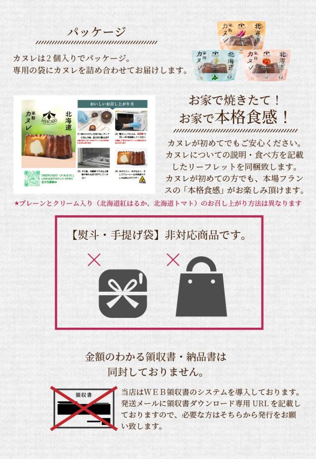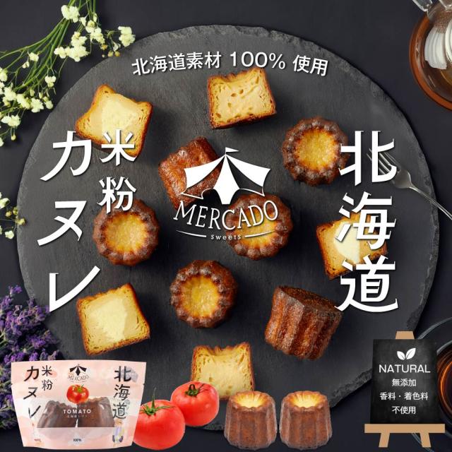| 商品説明 | 札幌場外市場にあるスイーツ店「メルカードスイーツまる」より、新ブランド「MERCADO」が誕生! 「MERCADO(メルカド)」とは、スペイン語で「市場」という意味。 こちらは、素材から製造・出荷まで、全てを北海道内で行う特別なカヌレになります。 MERCADOのカヌレは、小麦粉を使わないグルテンフリー食品ながらも「二段階熟成技術」により、カヌレ本来のおいしさを実現。 さらに、やさしい甘さのふわふわクリームを加えた、全く新しいカヌレです。 グルテンフリーにつき、小麦アレルギーの方にも、安心してお召し上がり頂けます。 小麦粉不使用、ラム酒不使用、保存料等の添加物等も使用しておりません。 甘味には「てんさい糖」を使用して、やさしい甘みに仕上げました。 そして、北海道岩見沢・栗山産のトマト「夏の旬」を主に使用。 是非とも新ブランド「MERCADO」の特別なカヌレをご賞味ください。 |
