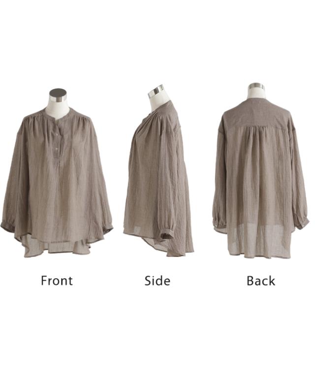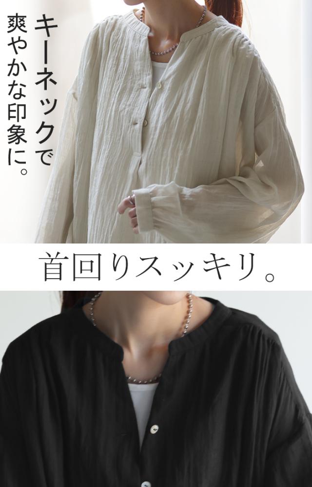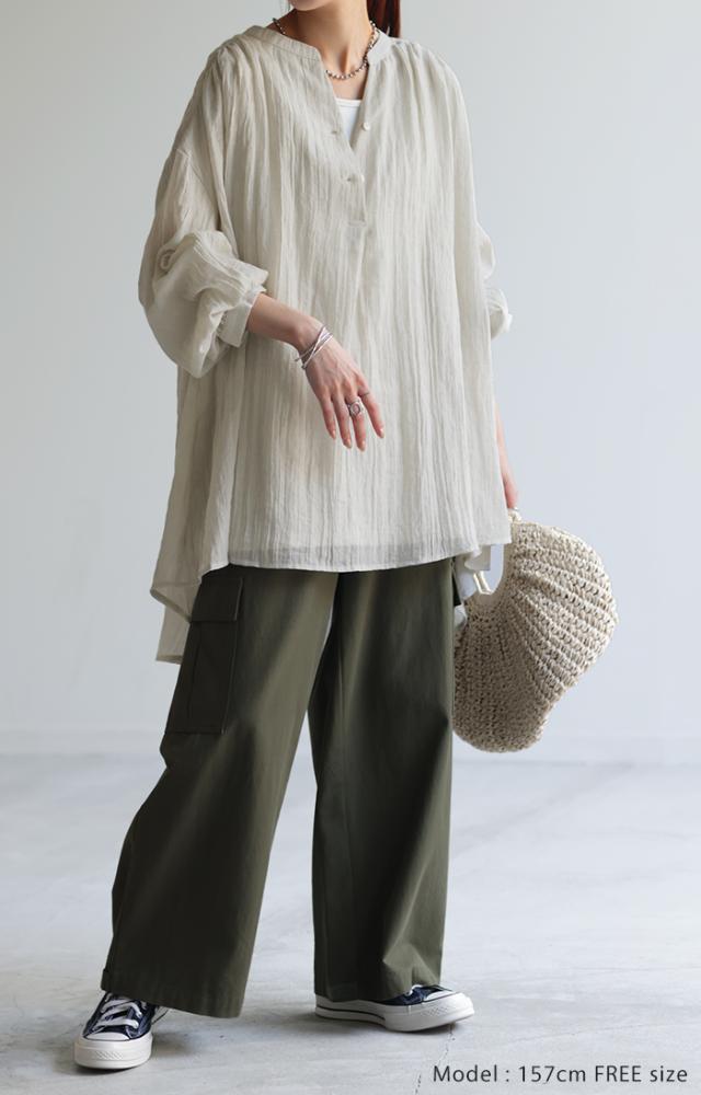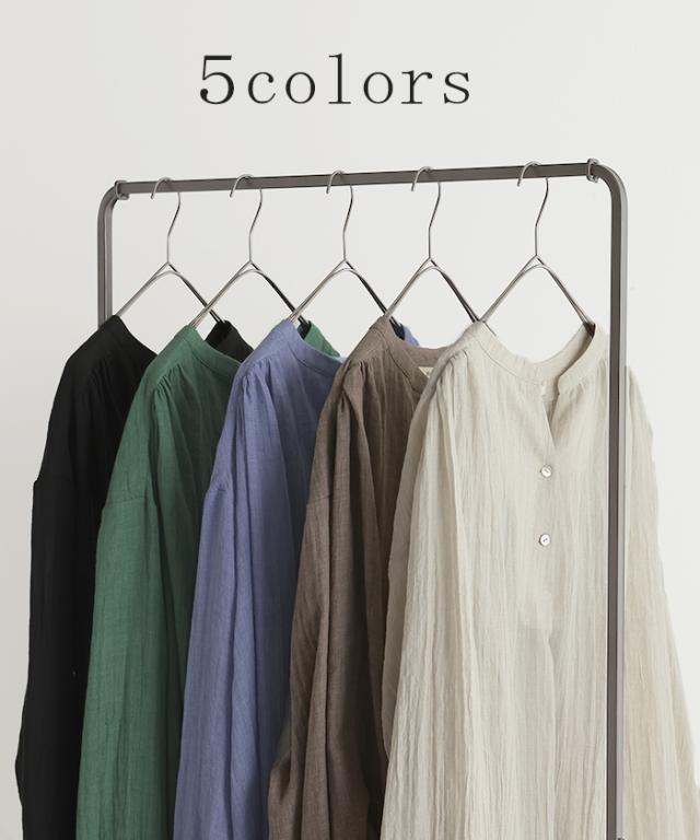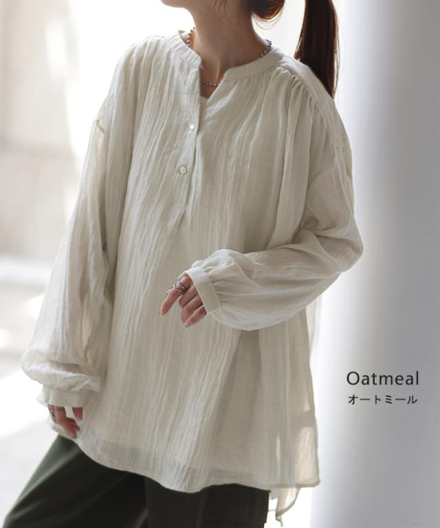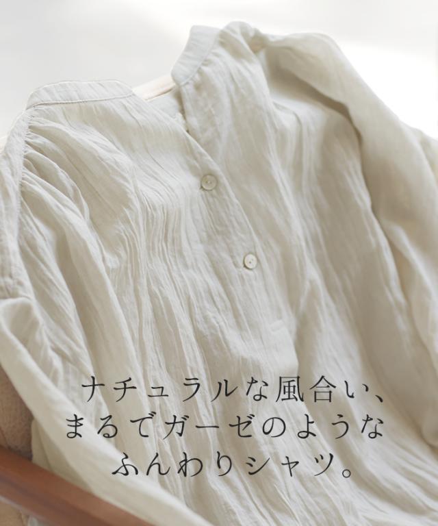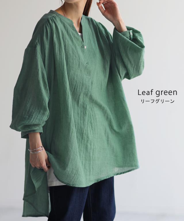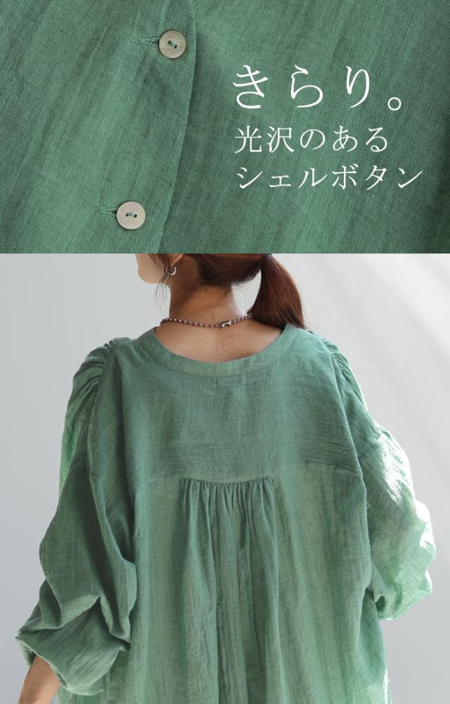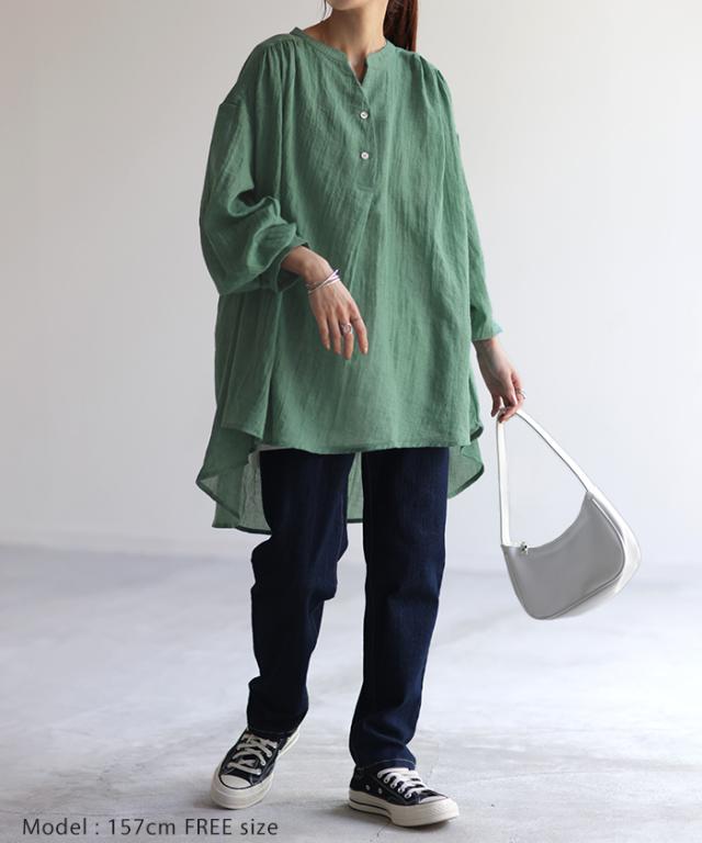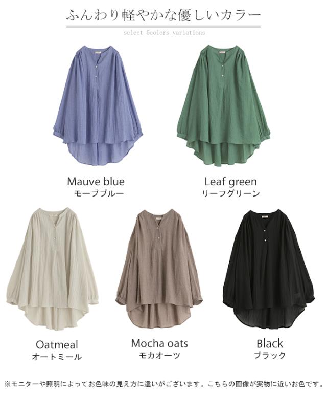 シャツ ナチュラル スキッパー 綿 一部4月中旬入荷 混 チュニック バンドカラー トップス 長い レディース ギャザー ロングシャツ 長袖 ノーカラー ロング ブラウス シボ感 ゆる ビッグ 体型カバー オーバーサイズ 大きいサイズ 無地 グリーン 白 春 夏 HUG.U 秋新作