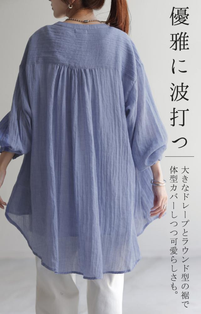 - 軽くてガーゼのように肌触りが良くふんわり涼しいです。お尻も隠れるのでパンツ、スカートにも合わせやすく大活躍です