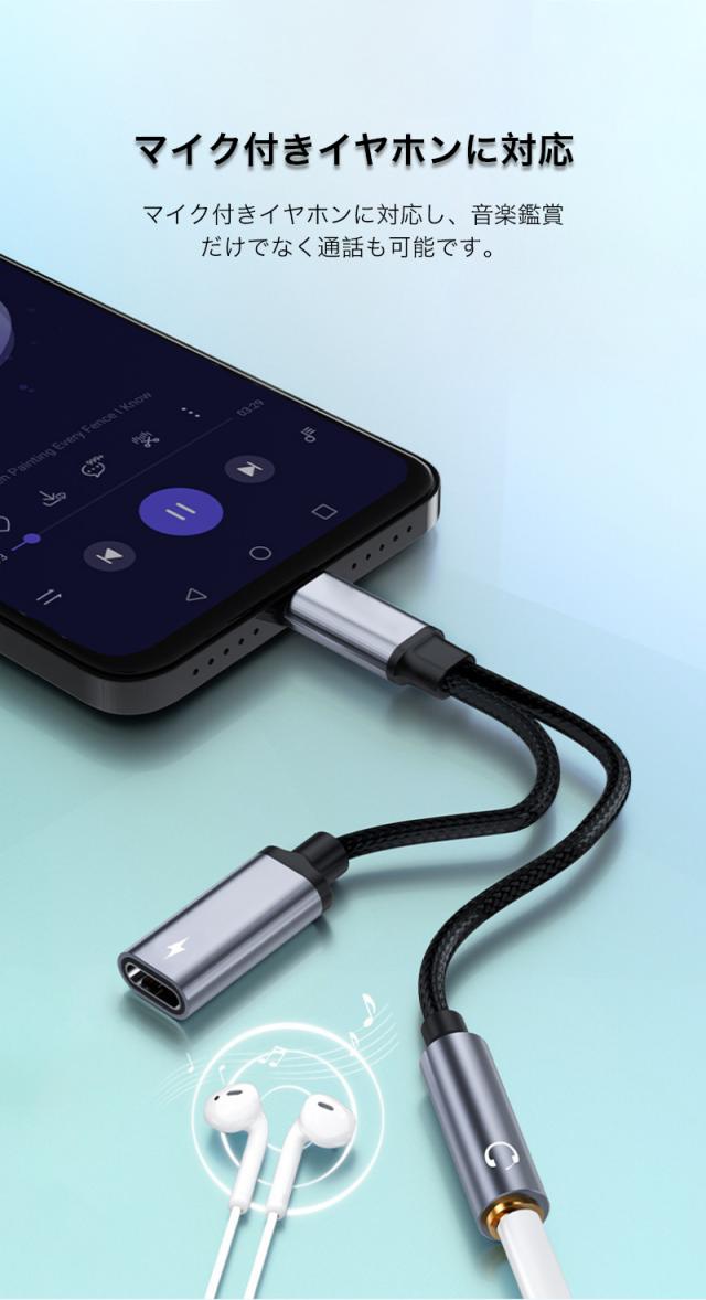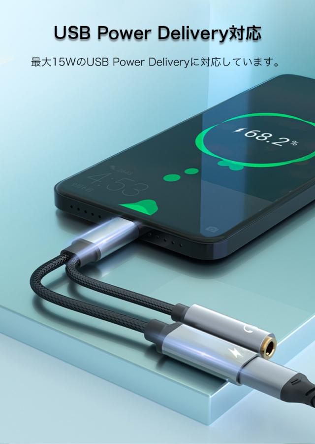 スマホ/タブレットの音声出力に対応したUSB Type-端子を3.5mmステレオミニ端子と給電専用USB Type-Cポートの2つに変換する音声変換ケーブルです。