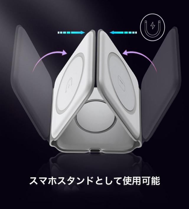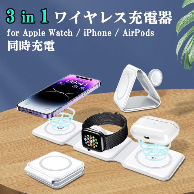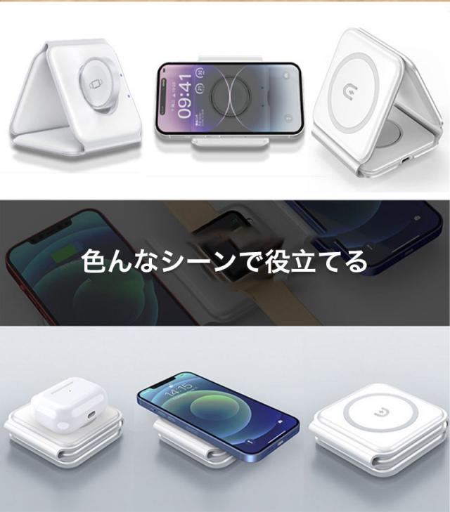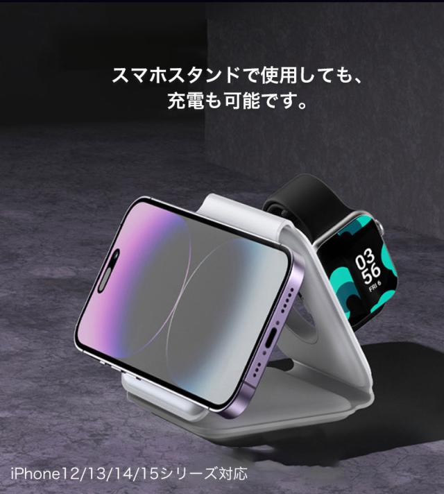 ワイヤレス充電器 iphone 15 14 Apple Watch AirPods 3in1 ワイヤレス充電器 magsafe対応 折りたたみ式 急速充電 置くだけ スタンド機能