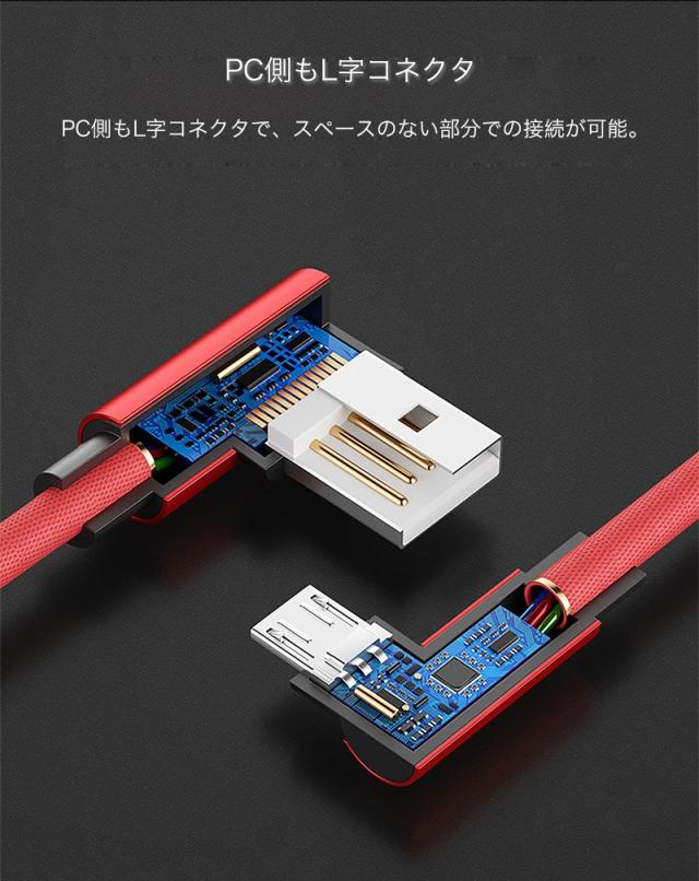 ケーブルの出っ張りを抑え、スマホにスマートな配線ができるL字コネクタを採用、データ転送や急速充電が可能な Type-Cケーブル。