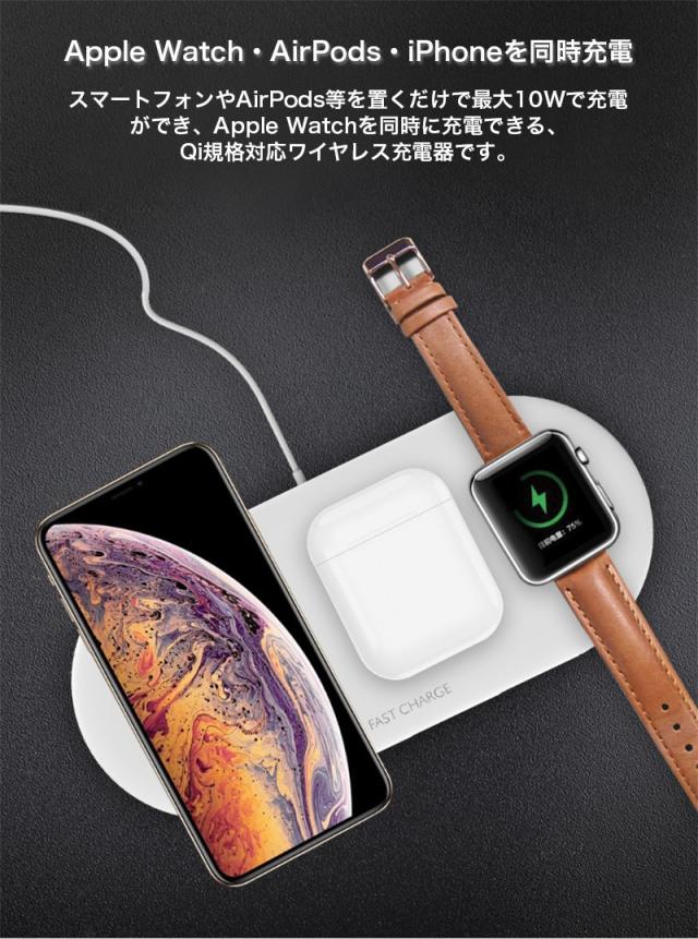 スマートフォンやAirPods等を置くだけで5Wで充電ができ、Apple Watchを同時に充電できる、Qi規格対応ワイヤレス充電器です。