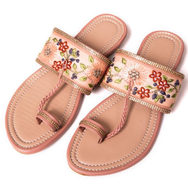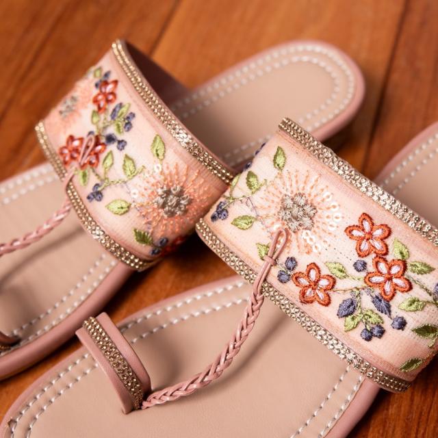 チャッパルと呼ばれるゴージャス刺繍のサンダル サーモンピンク / フラットシューズ パンプス 靴 ペッタンコ靴 TIRAKITA(ティラキタ) インド アジア レディース エスニック衣料 アジアンファッション エスニックファッション
