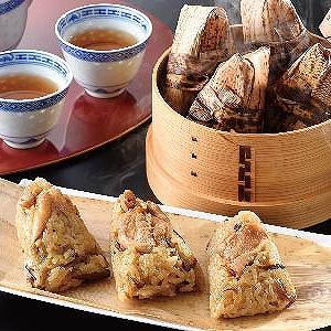 国産のもち米だけをサワラ材のせいろでじっくり蒸し上げ、国産の舞茸を混ぜ込んだおこわに赤鶏の味付け肉をトッピングして、中華ちまきに仕上げました。