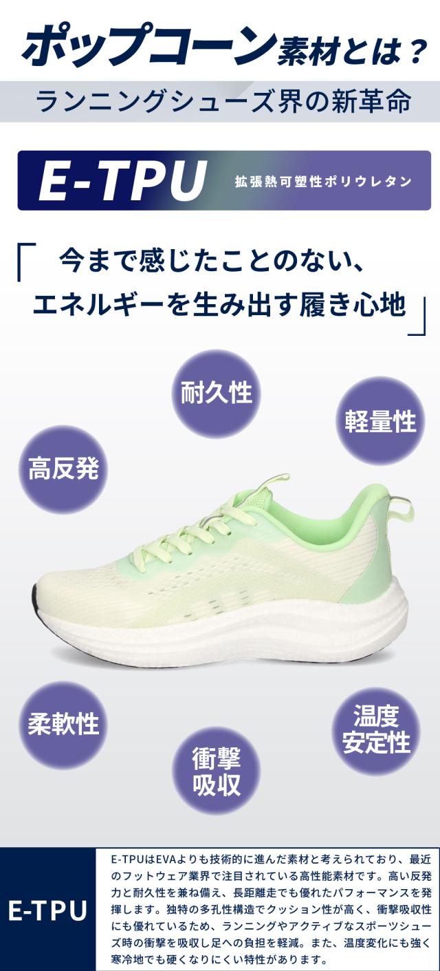 | わずか200gの超軽量設計で、まるで何も履いていないかのような感覚。足の動きを妨げないので、長時間のランニングでも疲れにくいです。発泡技術により進化したE-TPUソールを使用。優れた反発力と耐久性を兼ね備え、アスファルトからトレイルまであらゆる地面で最高のパフォーマンスを発揮します。メッシュ構造のアッパーが最適な通気性を提供し、足元を快適に保ちます。長距離ランでも足の蒸れを最小限に抑えます。足の形状に合わせて設計されたインソールが、適切なサポートとクッション性を提供。ランニング中の足への負担を軽減し、安定した走行を実現します。 |