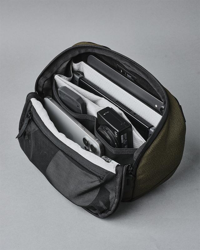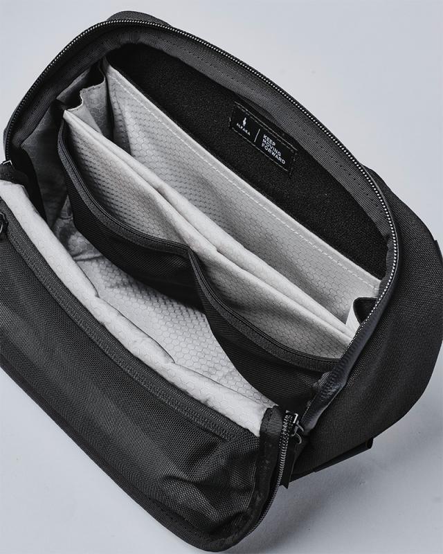 | メインコンパートメントは仕切りが付いており、移動時の荷物のズレを心配しなくてもいい仕様。 | 背面から前面に掛けて仕切りが低くなり、視認性もしっかりと確保。 | |
