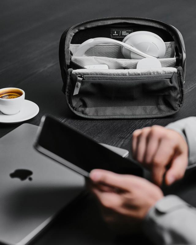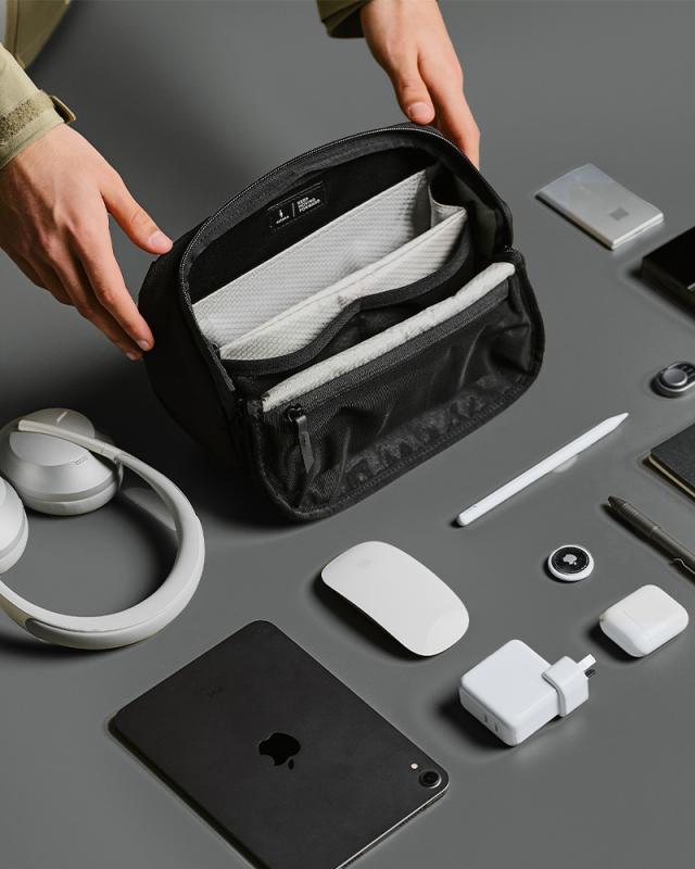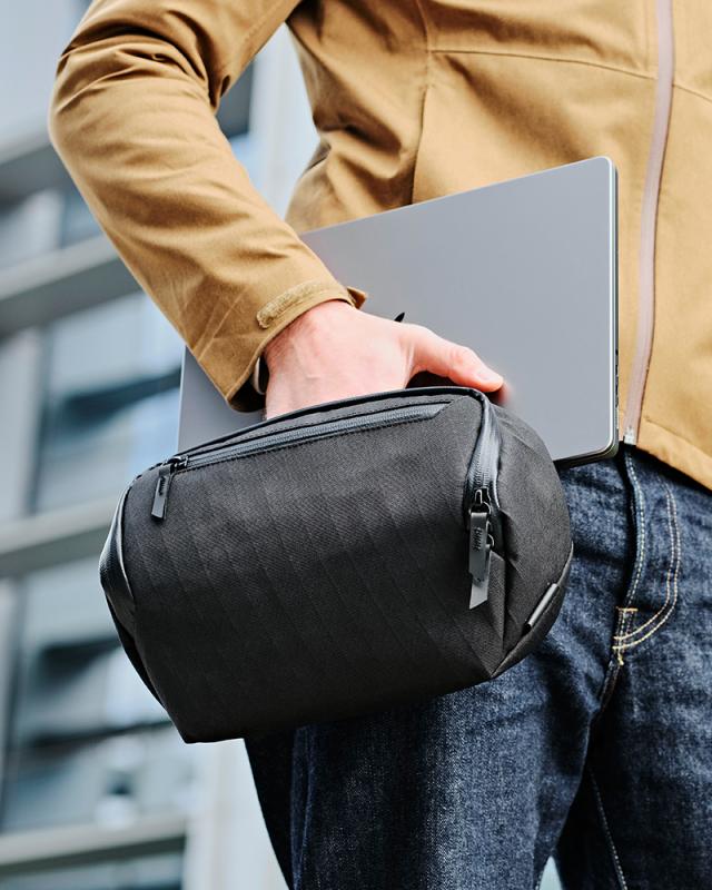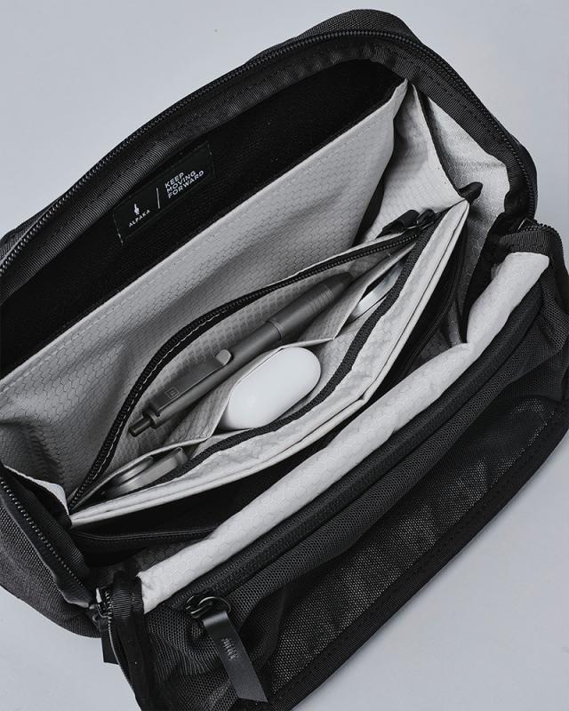 日常の必需品を外出先でも整理整頓できるように設計したショルダーバッグ。取り外し可能なストラップでポーチとしても使用できます。アコーディオンスタイルのメインコンパートメントはiPadなどの必需品の収納が可能です。