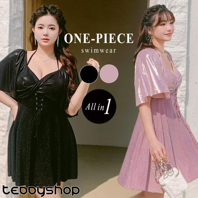 春新作 ぽっちゃり プラスサイズ 水着 ワンピース 体型カバー レディース 大きいサイズ 4L 5L 6L 半袖 メタリック生地 ホルターネック ツイストデザイン レースアップ ラメ入りスカート ワイヤー入り モールドカップ バスト 盛れる 二の腕 ウエスト