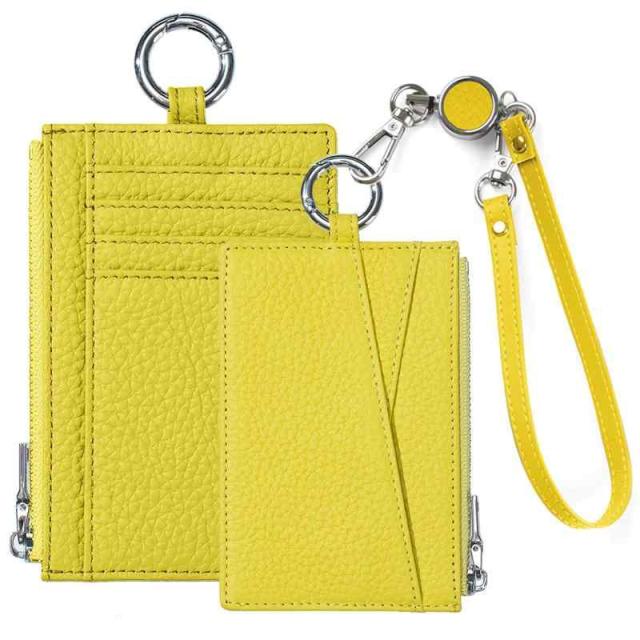 [Bearneko] パスケース 薄型 カードケース 小銭入れ 本革 フラグメントケース 定期入れ リール付き カード入れ コインケース レディース メンズ キーホルダー付 名刺ケース 男女兼用 (イエロー)