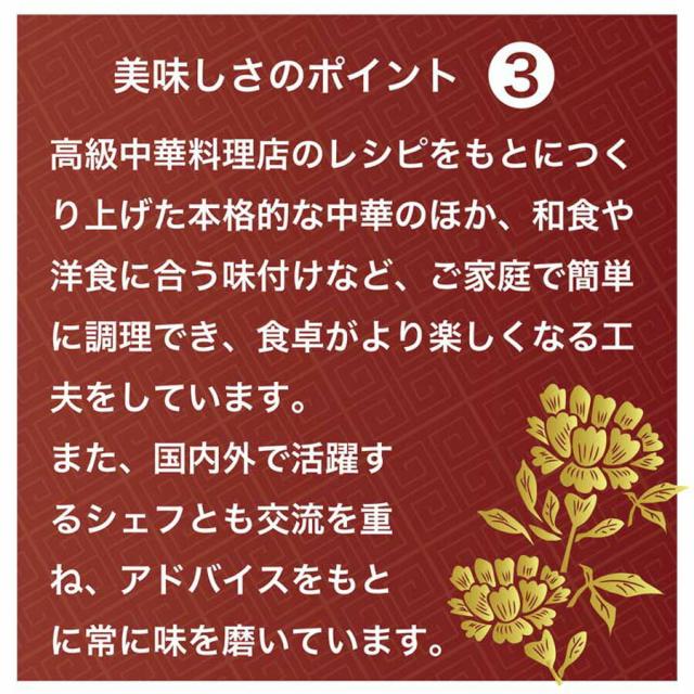 | 原材料名 | ガラスープ(豚ガラスープ、ぶどう糖、その他)、ふかひれ、たけのこ、しいたけ、醤油、醗酵調味料、食塩、ごま油、カニペースト、シーフードエキス、生姜汁、砂糖、オイスターエキス、香辛料/増粘剤(加工澱粉、キサンタンガム)、(一部に豚肉・鶏肉・牛肉・大豆・小麦・ごま・かにを含む) |