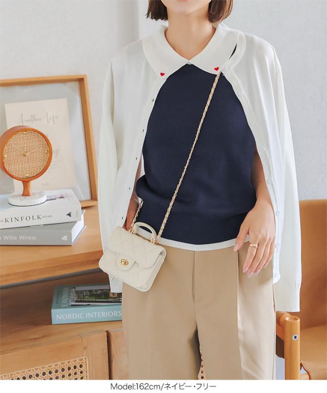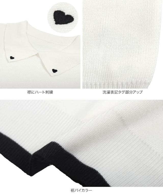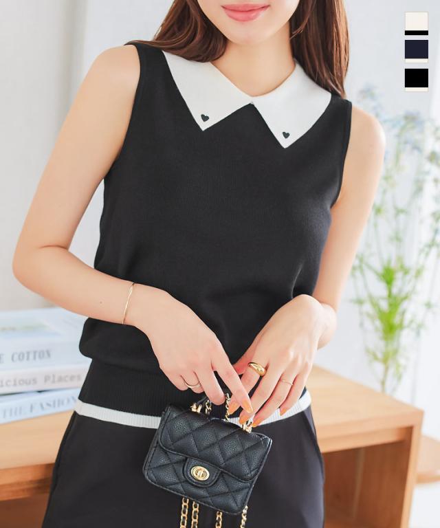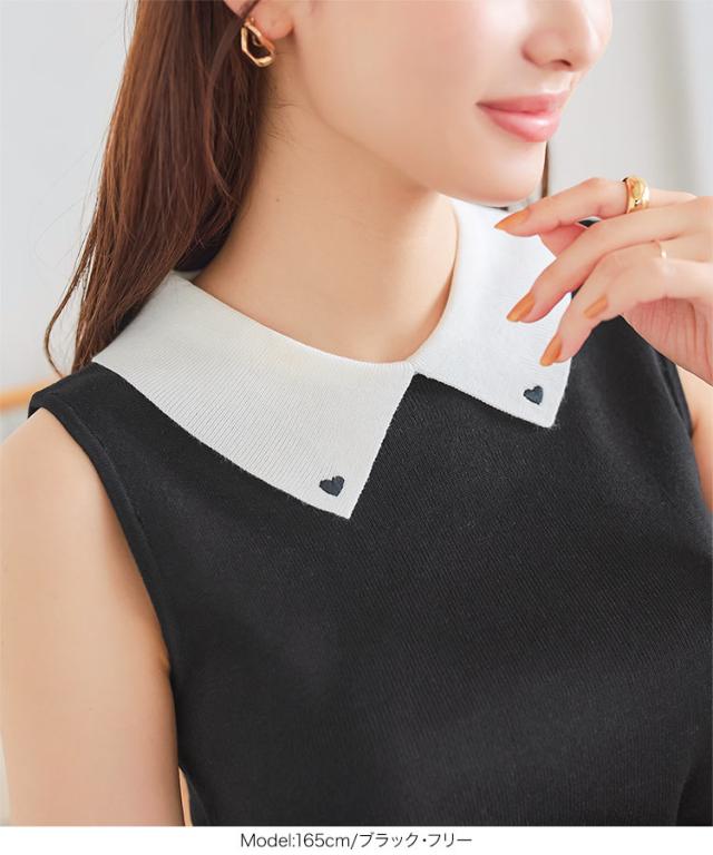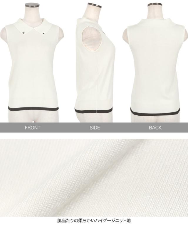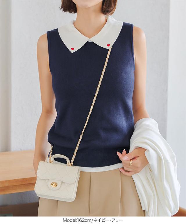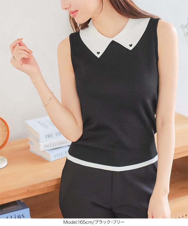 春新作 ハート刺繍ノースリーブニットトップス C7218 入荷済 レディース 20代 30代 40代 ノースリ ハート 襟 ポロシャツ スリーブレス バイカラー ワンポイント