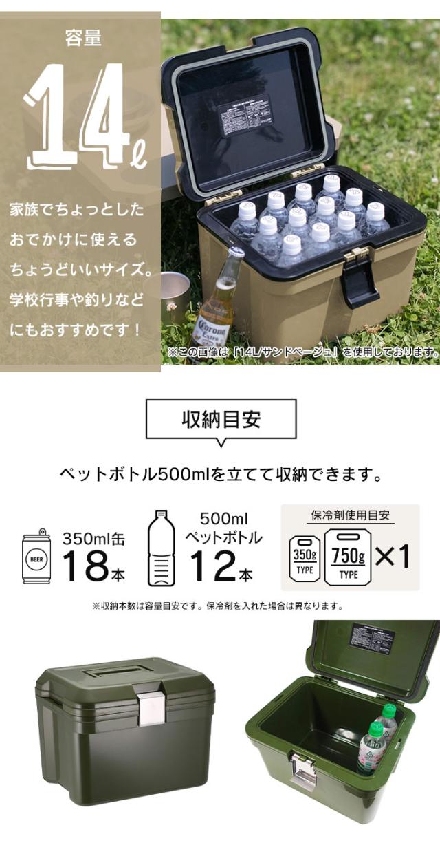| ・350ml缶:18本 ・500mlペットボトル:12本 ・保冷剤使用量目安:350g・750g 各1個 (※収納本数は目安です。保冷剤を入れた場合は異なります。) |