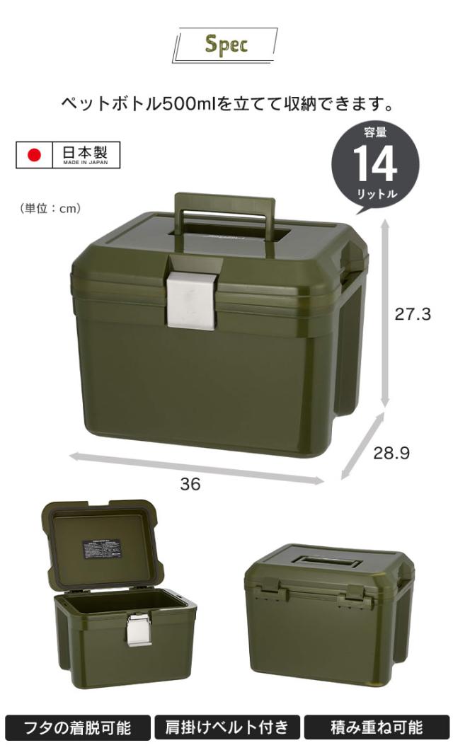 | ・フタの着脱可能 ・肩掛けベルト付き ・積み重ね可能 |