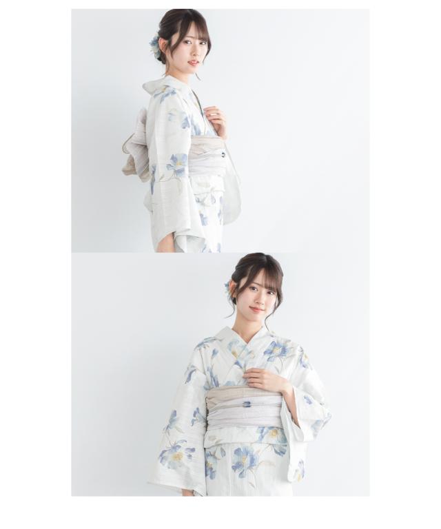 新作コーデ!bonheur saisons 浴衣セットです。 内容は【浴衣・帯・下駄】の3点セットです。 浴衣生地は、柔らかい肌触りと吸湿性に優れた綿100%です。 帯は化繊素材です。 仕立て上がりですので、お届け後すぐにお召しいただけます。
