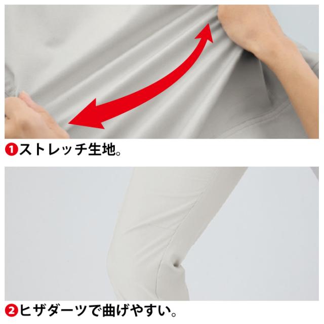 ◇機能:接触冷感。伸縮素材。帯電防止。速乾性。吸汗性。ストレッチ。膝ダーツで曲げやすい。右脇コインポケット。左脇Dカンループ付。前中心は丈夫な3YGファスナー。左後はフラップ付きビスポケット。右脇横ポケットはファスナー仕様とモノの出し入れしやすいマルチポケット。左脇横ポケットはペン差し付き。