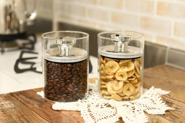余分な空気を減らして酸化を防止し、湿気を嫌う茶葉やパスタ、コーヒー豆が傷みにくいガラス容器です。