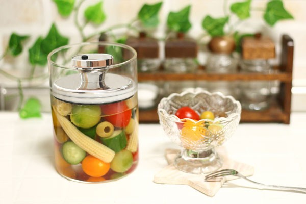 液体が漏れないので梅酒作りや漬け物など漬け料理に最適です。そのまま食卓に出せるデザインです。