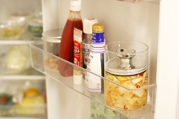 ガラス製なのでにおい移りや色移りの心配もなく、見た目がすっきりして冷蔵庫の中でも中身が一目瞭然です。
