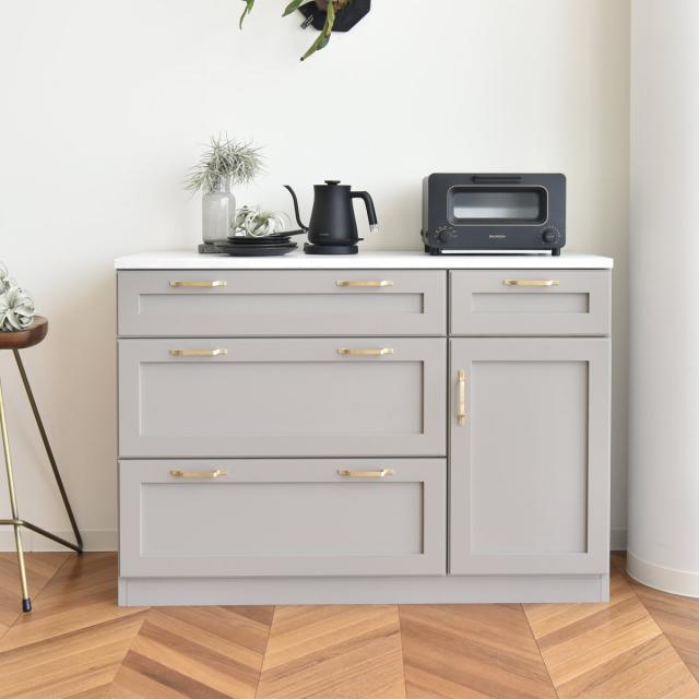 落ち着いたグレーカラーと真鍮の取手の組み合わせが、レトロモダンな雰囲気を演出するキッチンカウンターです。広々と使える天板と充実した収納でキッチン周りの物をスッキリと片付けられます。