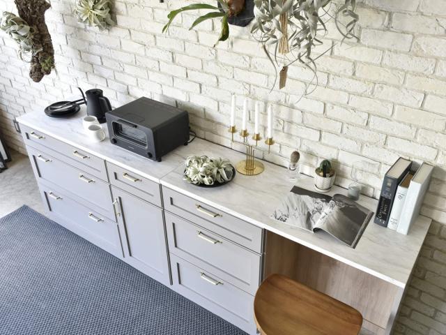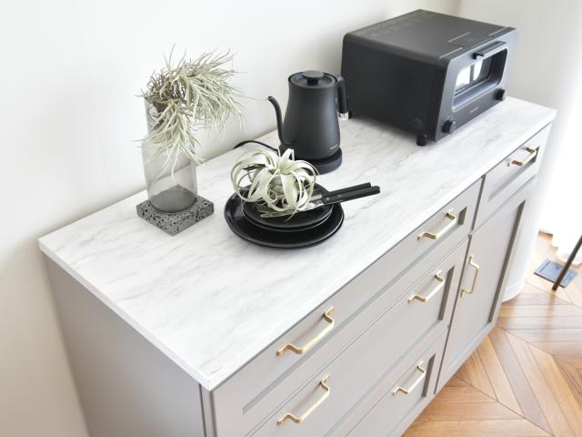 幅120×奥行44.5cmの高級感のある大理石調の天板です。広々としたスペースなので食器や料理の一時置きに使用したり、電化製品の設置、本や植物、インテリアを飾ったりと様々な使い方ができます。