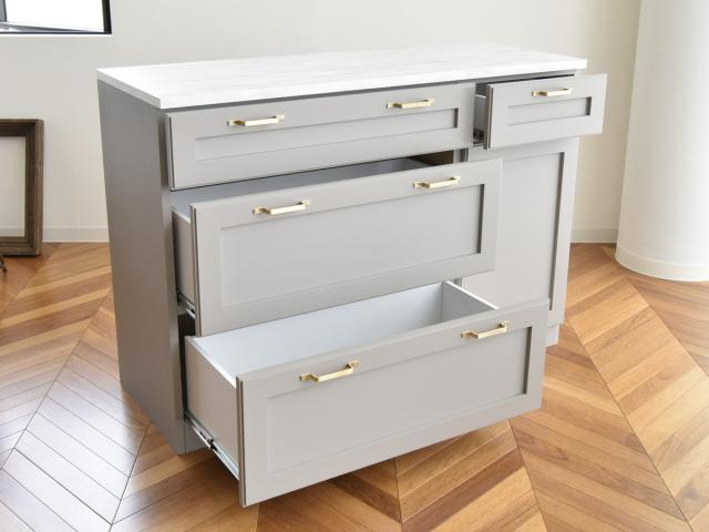 大きさの違う引出しが4杯付いています。上段の浅型の引出しはよく使うキッチンツールなどの小物類、深さのある下段は重さのあるお鍋や食器などの収納に便利です。