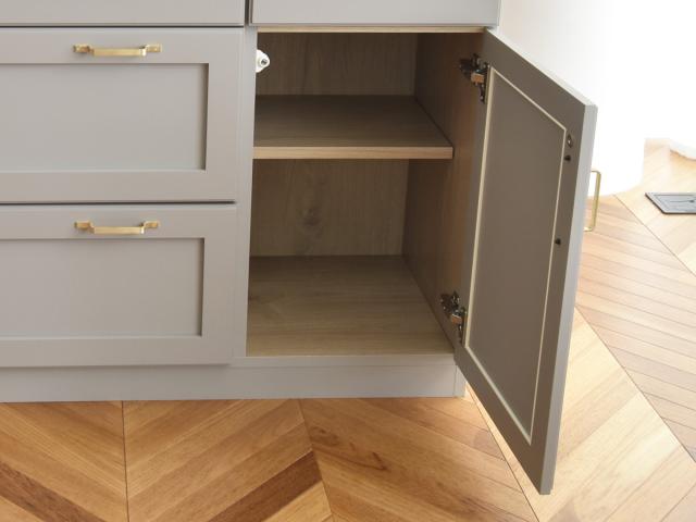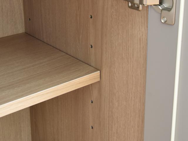 パッと開けられて、物の出し入れがしやすい開き扉収納付きです。収納物に合わせて高さを調整できる可動棚付きなので、高さのあるボトルも収納できます。