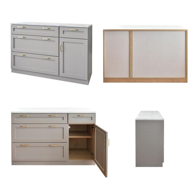 | 材質 | 本体:プリント紙化粧繊維版 天板:メラミン化粧繊維版 前板:MDF・オレフィン化粧繊維版 ハンドル:真鍮ヘアライン 塗装:エナメル塗装(艶なし) |
