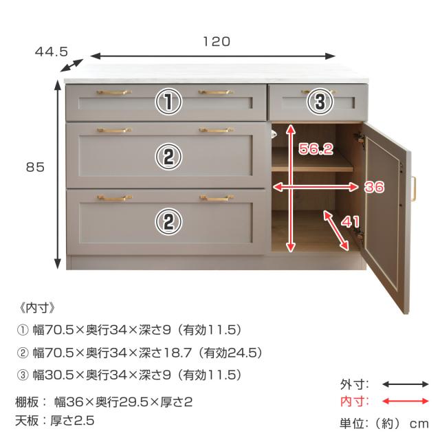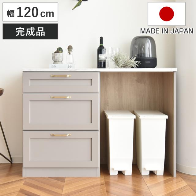 キッチンカウンター 幅120cm メラミン天板 完成品 日本製 ビルネ ( 開梱設置 カウンター キッチン 収納 ラック 棚 食器収納 大理石調 食器棚 作業台 可動棚 引き出し グレーカラー スライドレール )