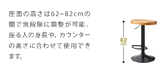 ・ガス圧式の高さ調節で座面を62~82cmの間で無段階に調節が可能。