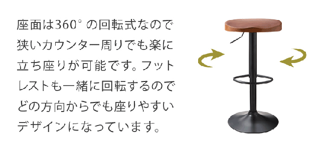 ・座面は360°回転式なので狭いカウンター周りでもイスを引かずに立ち座りができます。
