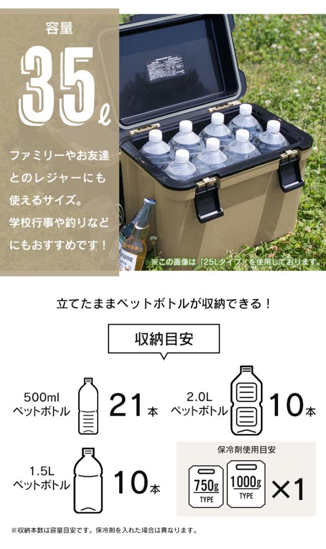 | ・500mlペットボトル:21本 ・1.5Lペットボトル:10本 ・2.0Lペットボトル:10本 ・保冷剤使用量目安:750g・1000g 各1個 (※収納本数は目安です。保冷剤を入れた場合は異なります。) |