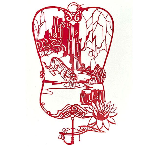 B級品【切り絵】額付 軍配 赤虎 水飲み B4 【送料無料】(沖縄別途1000円)| 箭紙,せんし,虎,タイガー,白虎,中国,中華街,アート,アンリマティス,雑貨,ノスタルジック,お土産,ギフト,プレゼント