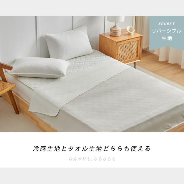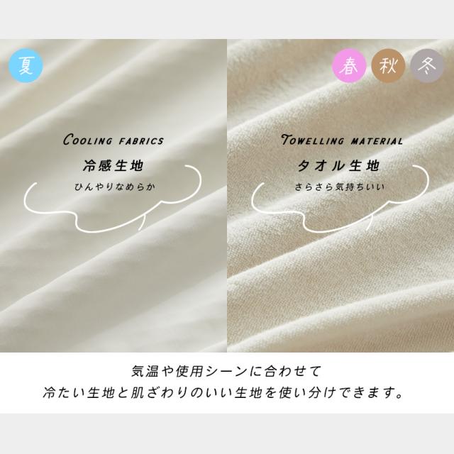 | 【リバーシブルで使えて年中使える】 冷感生地とタオル生地で表裏作られており 気温や使用シーンに合わせて生地を使い分けできます |