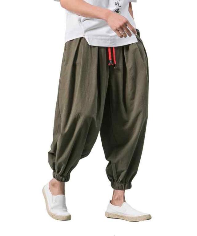 [FOMANSH] メンズ サルエルパンツ 9分丈 綿麻 無地 ガウチョパンツ カジュアル ワイド ゆったり 夏 (アーミーグリーン, M)