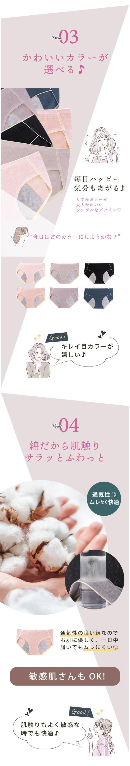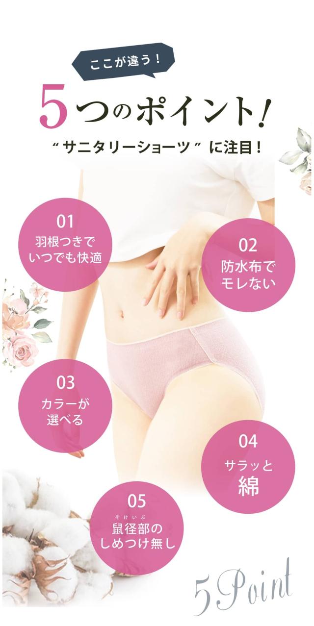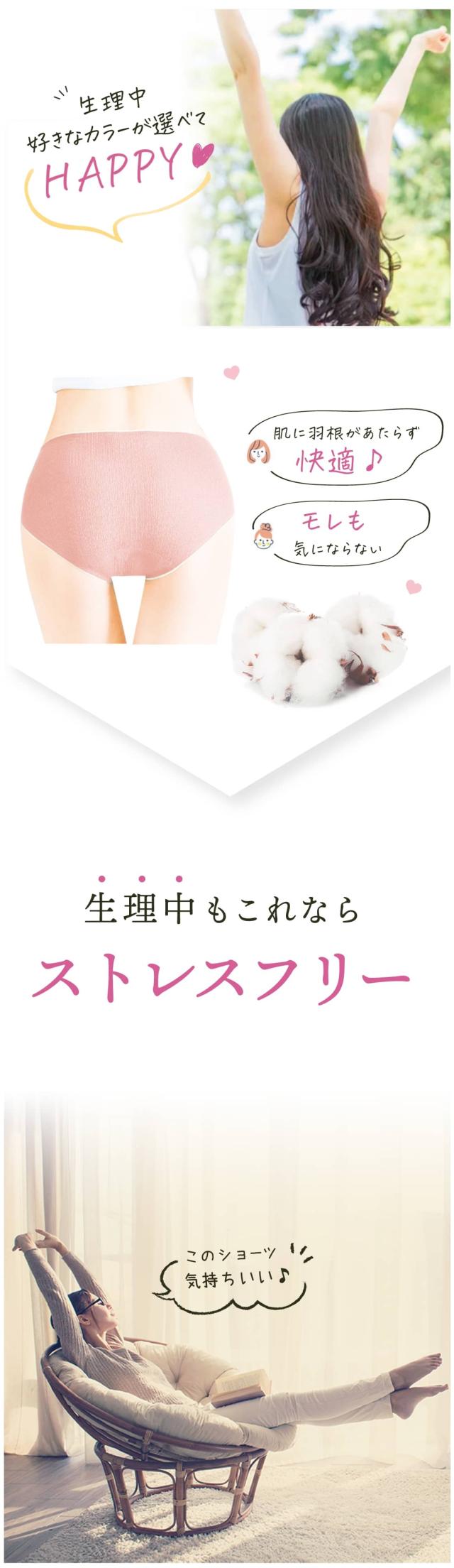 - 今までの生理用の下着は厚みがあり夏だと特に気になって変える回数が多くて、違うものを探していました。 薄生地で軽くい履き心地で、もちろん痛くなく私にピッタリでした。お手頃な値段なので駄目になったらすぐ買い替えれるので、衛生的にも良さそうです。色も可愛いのもいいですね。 またリピートしたいと思いました!