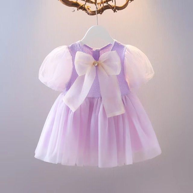 女の子 赤ちゃんのための蝶ネクタイ付き メッシュドレス 半袖 ワンピース かわいい プリンセスドレス パープル イエロー 2色 6か月〜3歳 春 夏 秋
