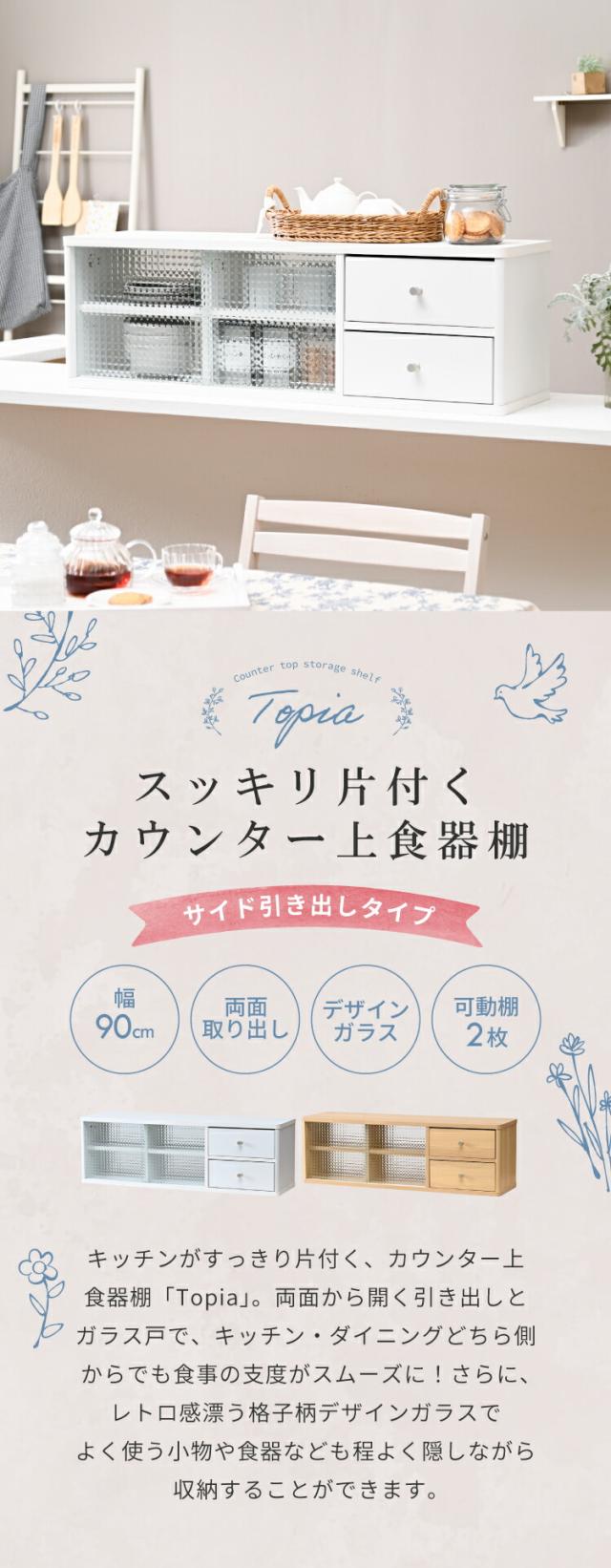 moca company トピア カウンター上 棚 ラック 調味料棚 ミニカップボード スパイスラック カトラリー収納 おしゃれ 両面開閉 お皿 コップ 調味料 幅90 90 奥行き 25 ホワイト ナチュラル 白 オーク
