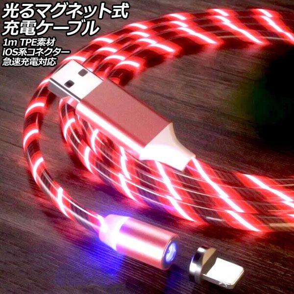 光るマグネット式充電ケーブル レッド 1m TPE素材 iOS系コネクター 急速充電対応 AP-UJ1064-RD-1M