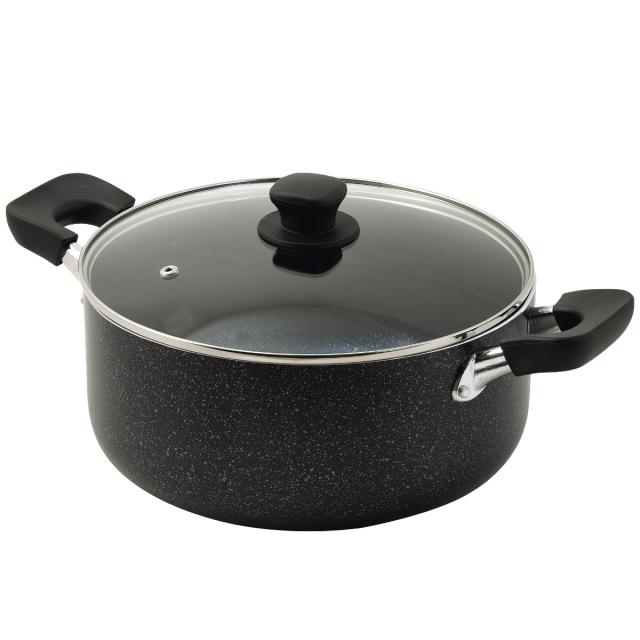 内面はダイヤモンド粒子を配合したマーブルコートを施しているため、キズや汚れに強く、金属製のキッチンツールの使用も可能です。焦げ付きにくいので、野菜を炒めてそのまま煮込むことができ、汚れも落としやすいので、お手入れも楽にできます。
